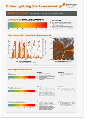The analysis shows e.g., the lightning intensity over the past five years, how often the turbines are immersed into the clouds, and the likelihood of undetected lightning at the site.