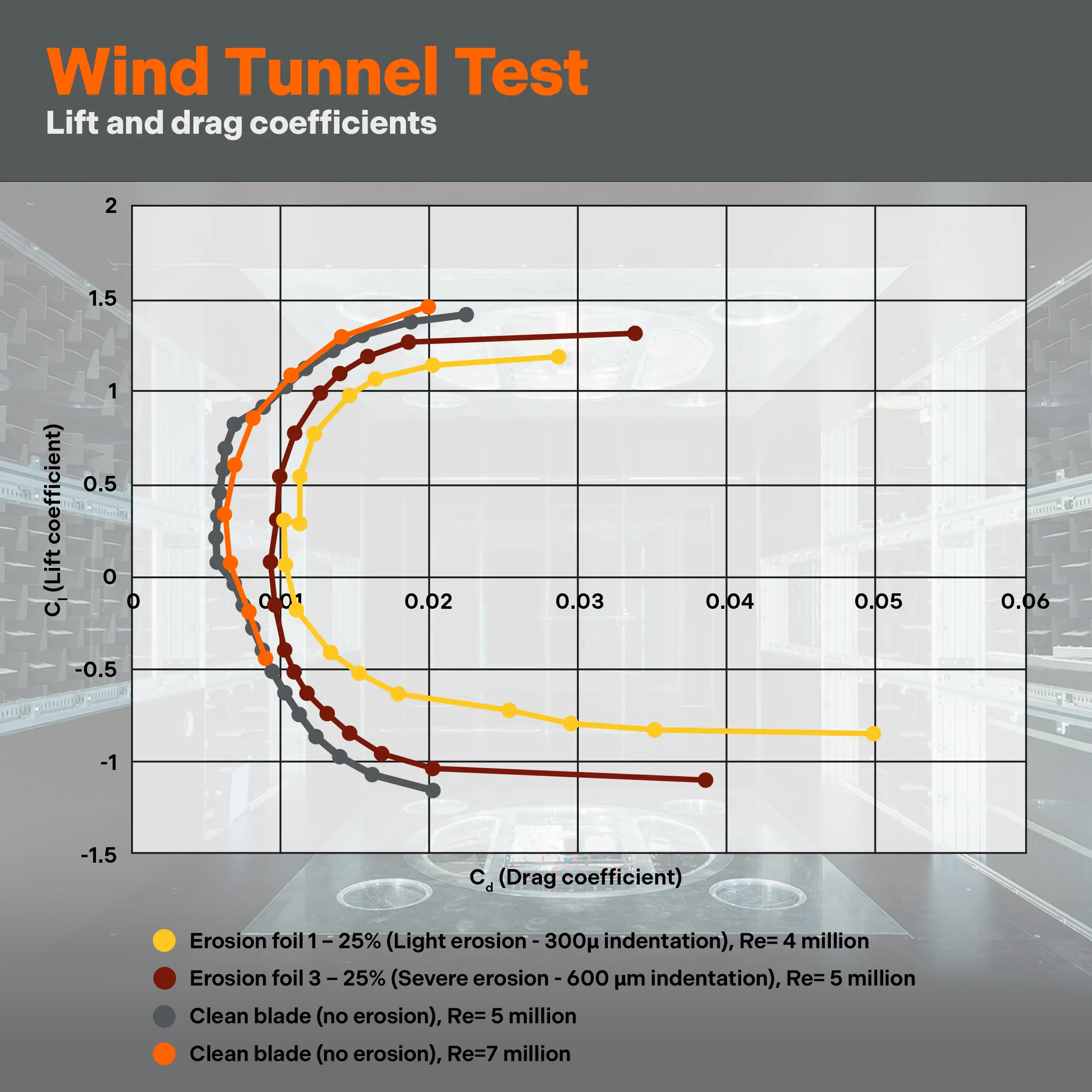 Wind tunnel test is the primary method to investigate the aerodynamic performance of airfoils. That is why we carried out a study with Vestas and the Technical University of Denmark (DTU) using DTU’s world-renowned wind tunnel testing facility. In the study, we examined how erosion and leading edge protection (LEP) solutions affect the blade’s aerodynamics.